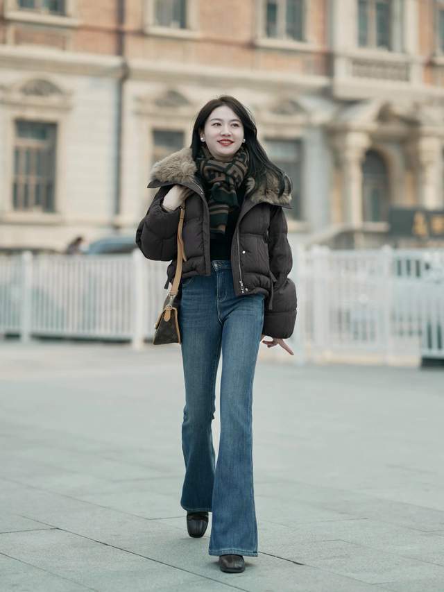 每个城市气温不同,需要的穿搭风格自然有一定的区别。虽然已经立春了,但是在北方城市天气还是比较寒冷的,这个时候我们可以选择一件短款的棕色羽绒服,搭配黑色的针织毛衣和蓝色的牛仔裤,这种上短下长的搭配,能使得穿搭者的身材比例变成三七分,显高显瘦不在话下,既保暖又洋气。