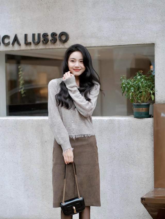 想让自己的身材线条比较流畅利落,可以选择一件 V 领的针织开衫,搭配上大地色系的直筒半身裙,而且属于上短下长的搭配方式,能使得穿搭者的身材变成三七分的比例,对小个子女性来说非常友好,显高显瘦。