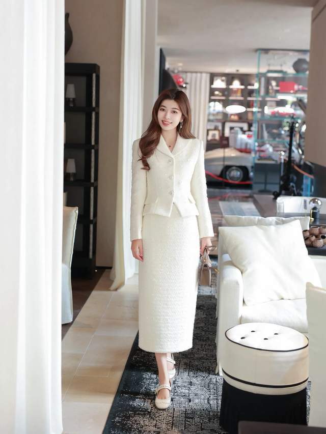 顺色的搭配确实更显高级,直接选择白色的西服裙装,脚穿一双白色的玛丽珍鞋,结合大波浪的卷发造型,就能使得穿搭者干练大方,这样的打扮不管是去上班、逛街、约会都没有任何问题,通勤又时髦。