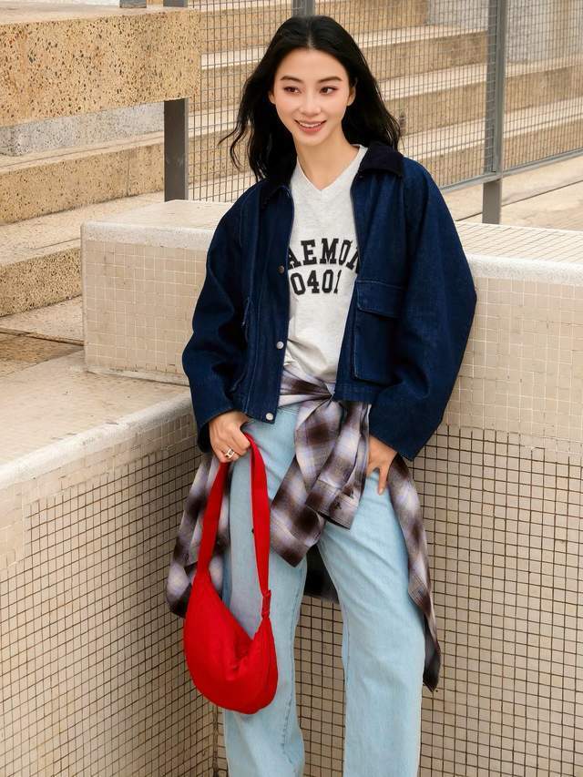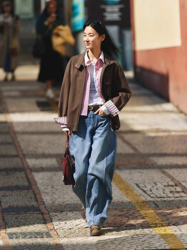 个子高挑的女性,想让自己的打扮有一种慵懒随性的松弛感,可以采用叠加的穿搭方式,一件棕色短外套内搭粉色条纹衬衫,叠穿印花字母 T 恤和一条牛仔阔腿裤就够,这时候脚上踩着一双拼接式的德训鞋,能增加造型的精致感和运动元素,这样的话,整体造型的个性搭配风格就出来了。
