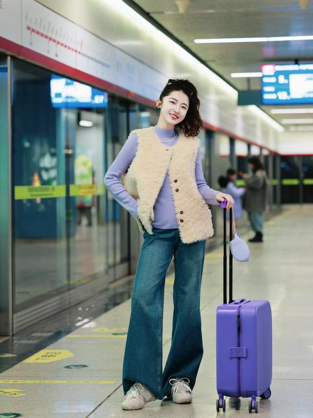 当你看到上面这位时尚博主的穿搭造型,是不是眼前一亮,确实穿衣很大胆,用一件紫色的针织毛衣作为内搭,外面再加一件白色的羊羔毛马甲,形成一个撞色的效果,让整体造型层次感更分明,再加上天生就拥有时尚元素的牛仔裤,脚穿德训鞋就够。