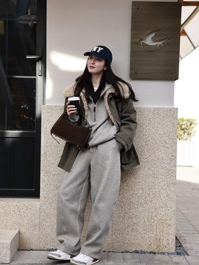 当你想象自己的穿衣打扮偏休闲风的情况下,这时候我们自然要用一双板鞋来搭配最佳,就好比上面这位时尚博主,就用一套灰色的休闲卫衣套装搭配上毛绒的短外套,就能轻松呈现出休闲的搭配风格,既舒适又保暖洋气。