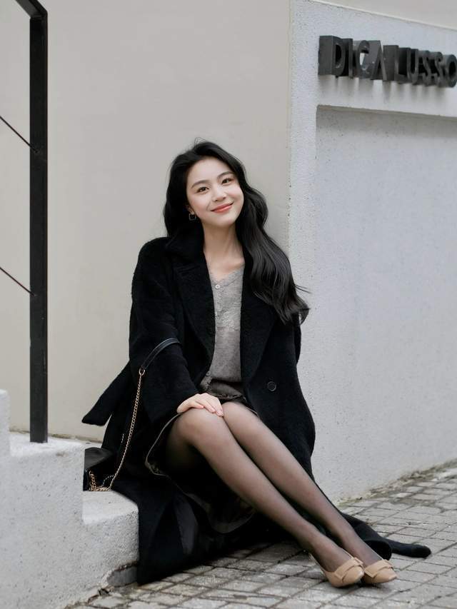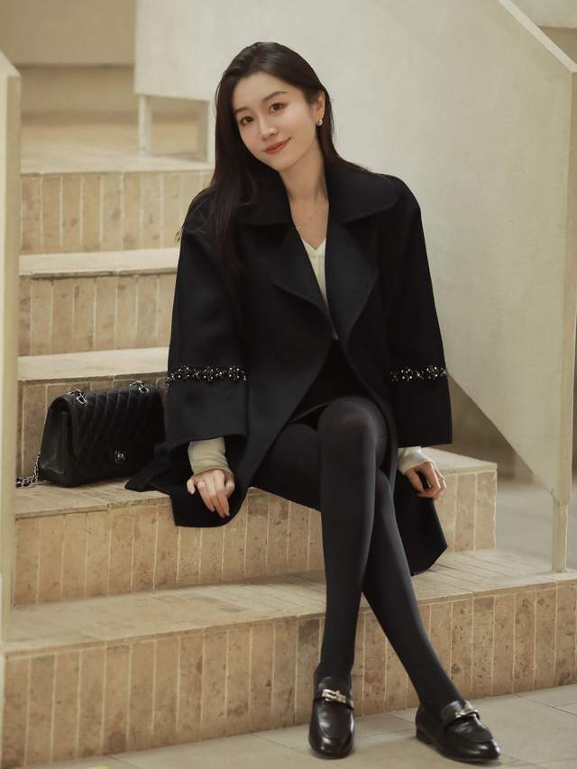 为了更加保暖,再用黑色的保暖打底袜来组合,更容易延伸你的腿部线条,脚要穿一双乐福鞋就够,这样的打扮俏皮又精致时髦。