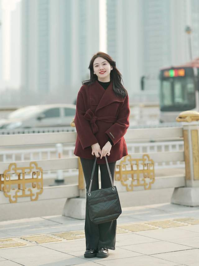 担心自己穿长款大衣会压个子的情况下,其实我们完全可以选择像上面这一种,X 型的红色短大衣,内搭黑色毛衣和一条牛仔长裤就够复古大方,穿的时候记得把腰带系起来,还能形成高腰线。