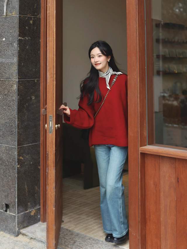 牛仔裤确实很百搭,就像上面这位时尚博主一样,直接用一件红色的毛衣搭配上蓝色的牛仔裤,脚上穿的黑色的皮鞋,这样的配色复古又洋气,过年的时候采用这样的穿法,你妈妈见到了都夸你一身真美。