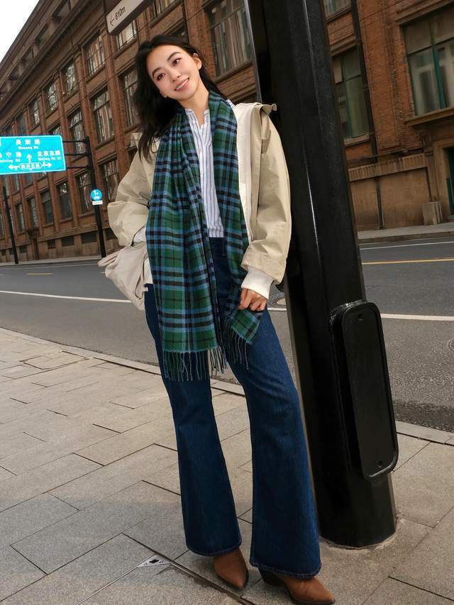 牛仔裤有一个优势,它天生就拥有时尚元素,比较百搭。像上面这一条蓝色的牛仔直筒九分裤,加上卡其色的外套,内搭一件条纹衬衫,脖子加上一条绿色格纹拼接的围巾,就能轻松呈现出休闲时尚风。这样的打扮真的很适合我们日常出门上班、逛街、旅游、拍照特别的出片。